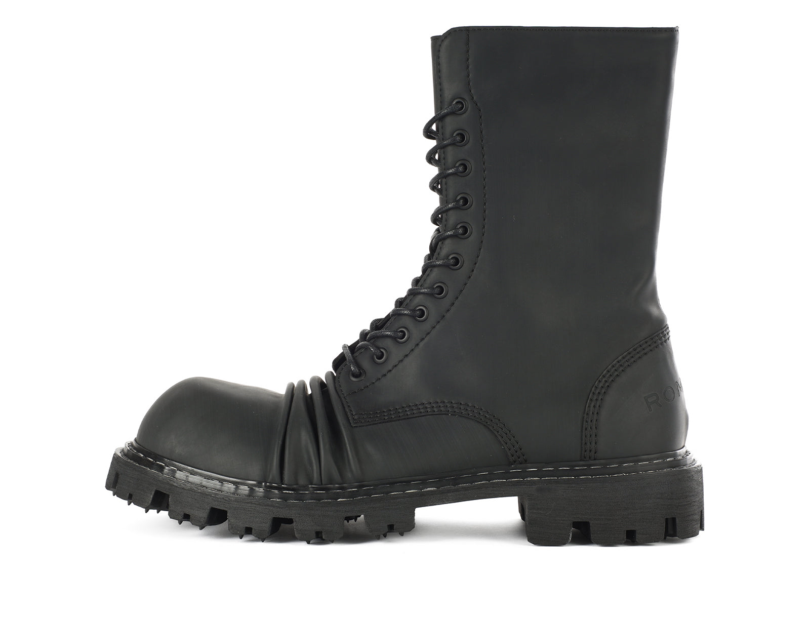 Black rubber combat style boot with laces and creased toe.