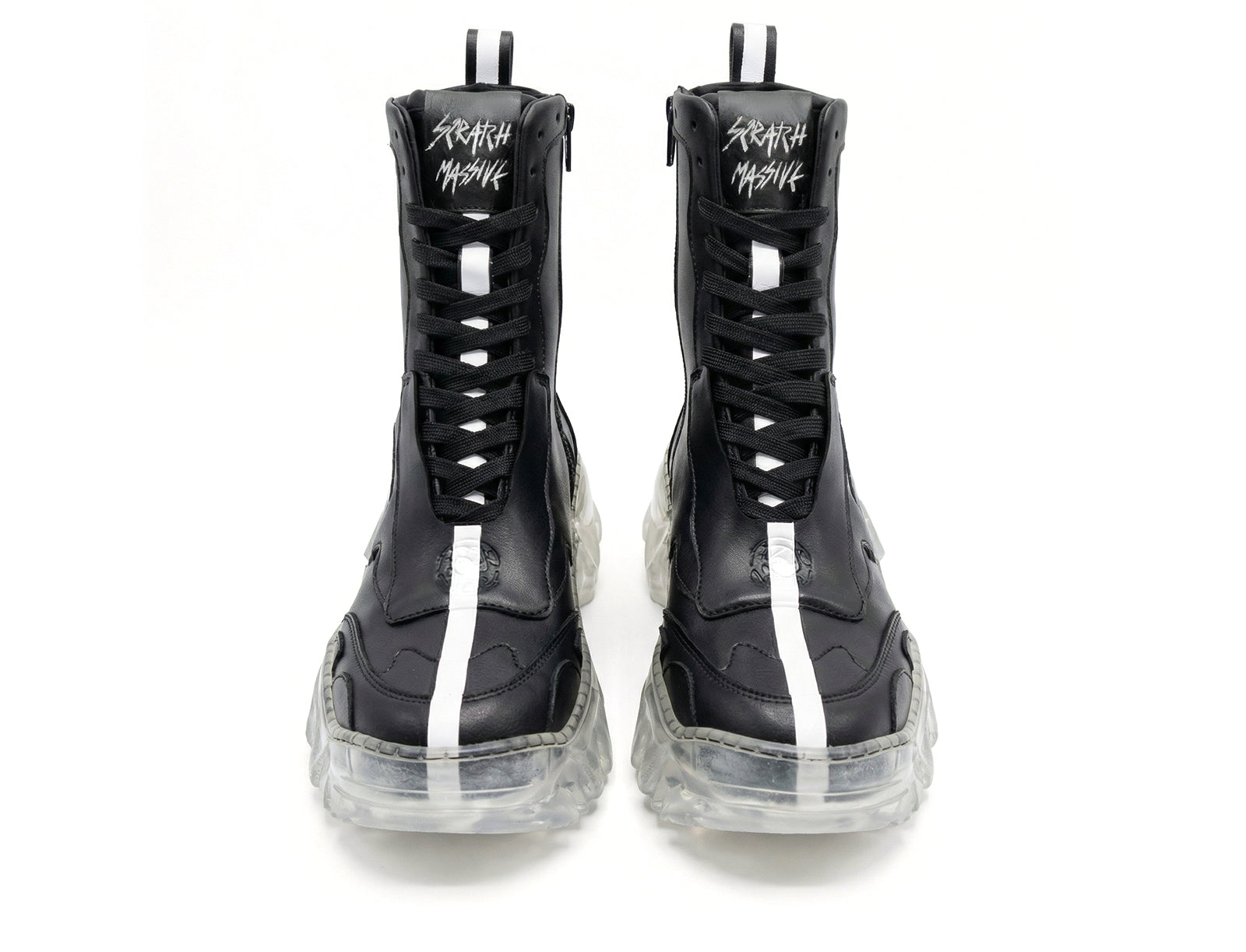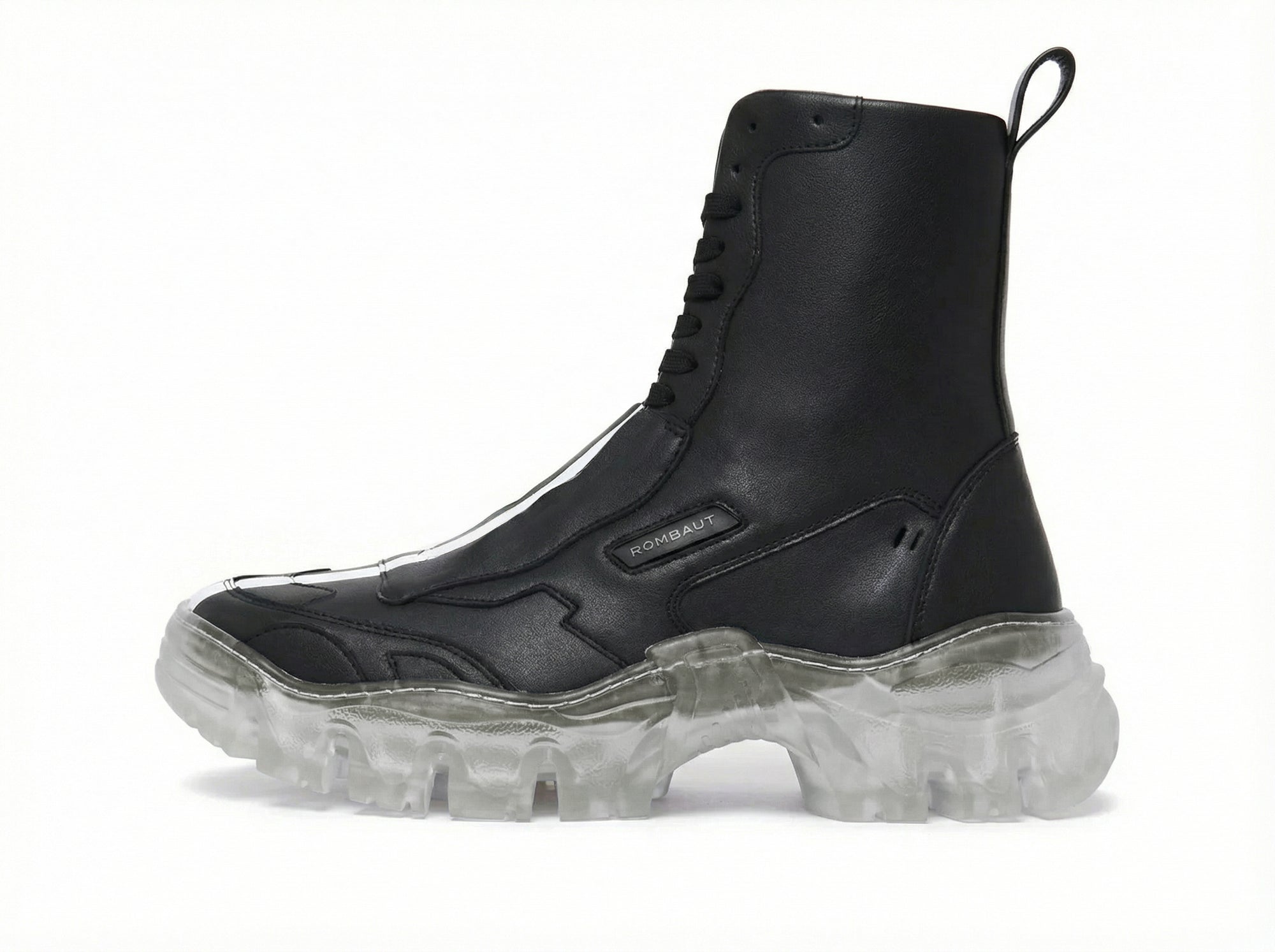 The collaborative boot updates Rombaut’s signature silhouette with a transparent sole, a striking white racing stripe down the center, and the band’s logo featured on the tongue. The result is a futuristic and sculptural aesthetic rooted in Rombaut’s sustainable design philosophy and Scratch Massive’s experimental creative spirit.